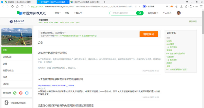 51视频高井祥、张绍良、张书毕教授课程教学团队在中国大学MOOC网提供三门在线课程资源,分别是《数字测量学》、《现代不动产评估》和《误差理论与测量平差基础》。这些课程通过前期建设,在中国大学MOOC(//www.icourse163.org/)网站提供在线教学环境和教学资源共享,战“疫”时期三门课程均对全社会公开开放服务,共克时艰,在线学习者数量累计超过6000名。中国大学MOOC课程平台提供了教学知识点视频、教学幻灯片PPT资料、测验和作业、课程相关知识资讯等线上资源。同时,教学团队还提供了线上讨论、答疑解惑交流等形式多样的教学服务。网络学习资源不仅传播知识,是课程教学的重要资源,同时也积极运用互联网凸显新时代社会科技发展。努力做到“师者,所以传道授业解惑也”,为社会学习者提供 “学习没有界限,越是在困难的时候越要珍惜学习的机会”的优质资源。