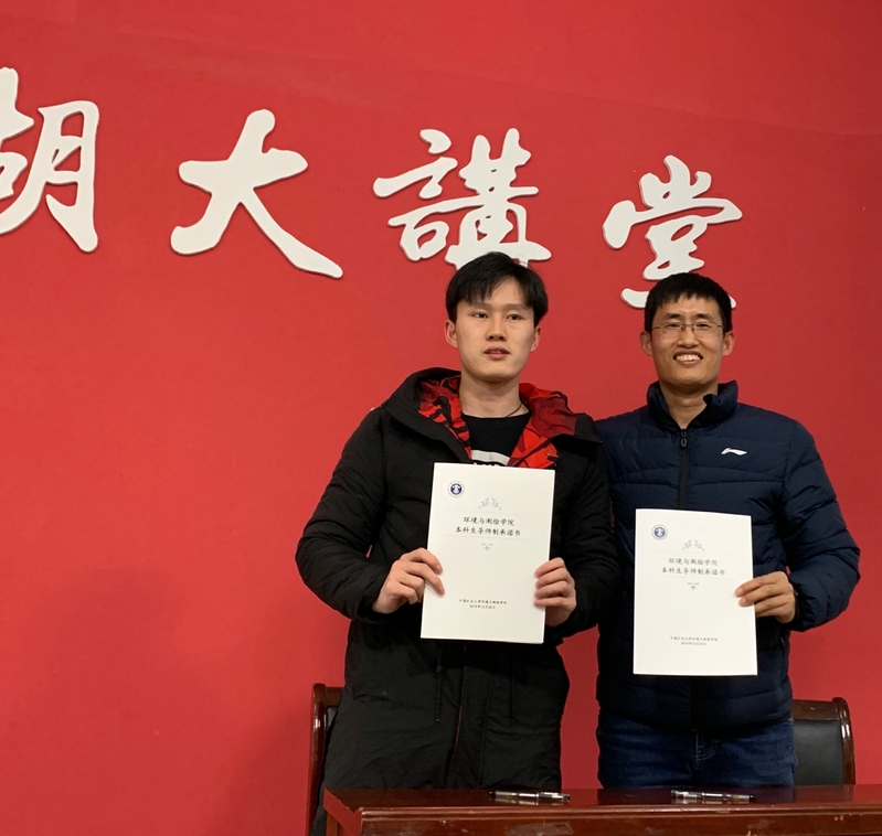 学术导师制导师代表郝明老师和学生代表王腾分别发表了讲话。启动仪式上,学术导师代表郝明老师与学生代表肖鑫签署了《环测学院本科生学术导师制承诺书》。