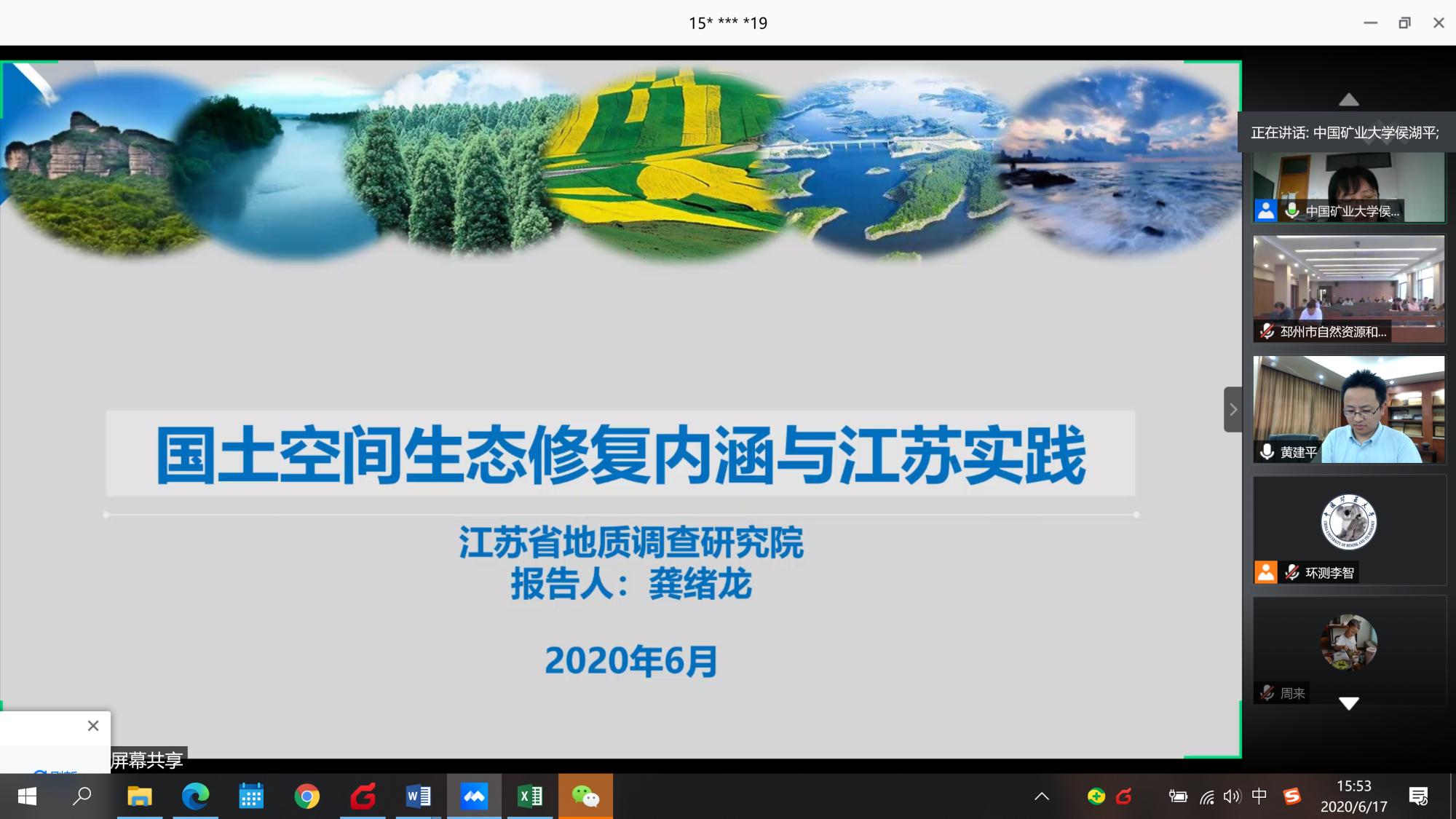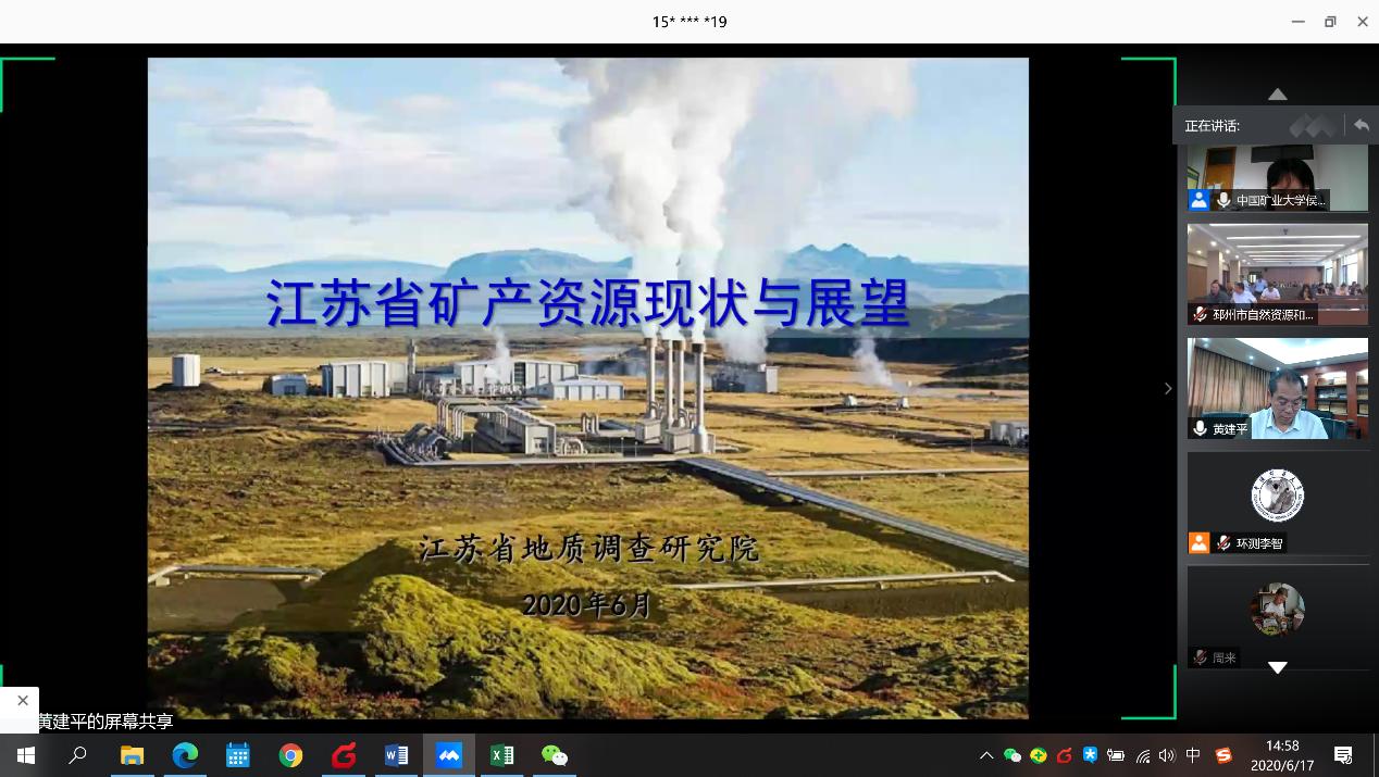 2020年6月17日下午,江苏省地质调查研究院矿产地质研究所所长黄建平、江苏省地质调查研究院科学技术部主任龚绪龙分别做了题为“江苏省矿产资源现状及展望”、“国土空间生态修复内涵与江苏实践”的线上学术报告。本次线上学术会议由51视频
