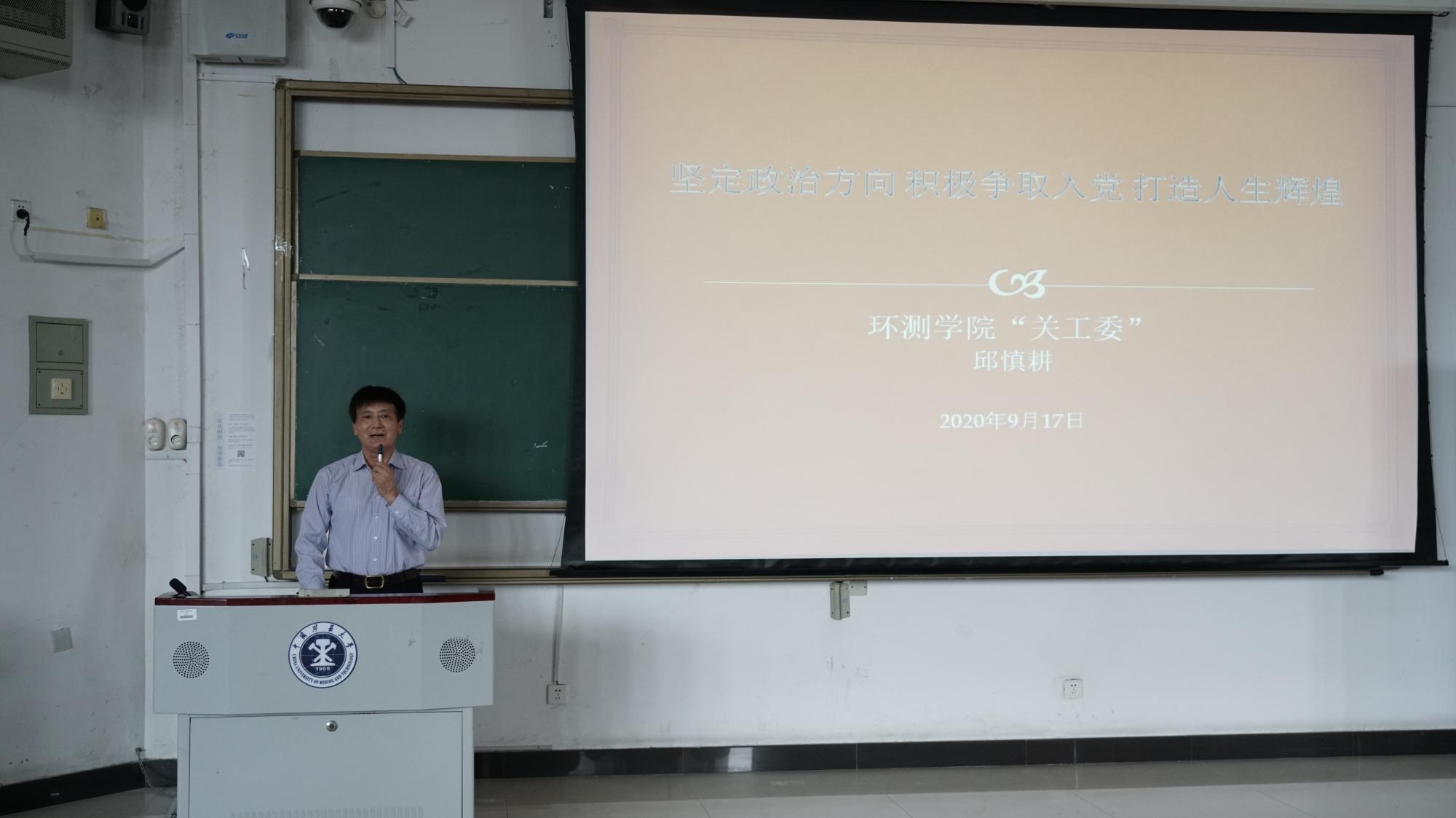 9月17日下午2时,环测学院在博2C302教室举行入党启蒙教育讲座。讲座由环测学院关工委常务副主任、校特邀党建组织员邱慎耕老师主讲,20级辅导员张莹老师主持,20级环测学院全体同学参加本次讲座。