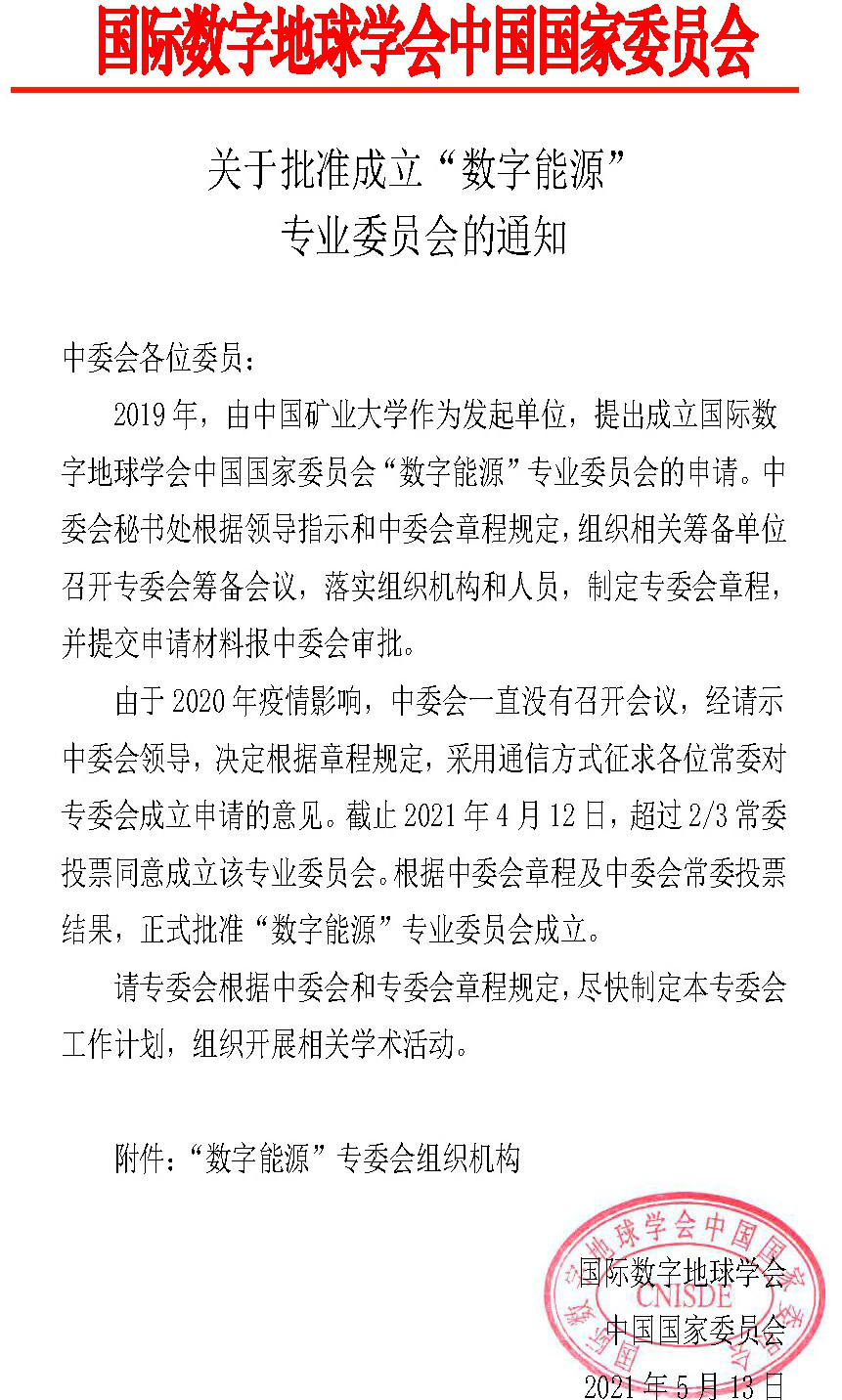 近日,国际数字地球学会中国国家委员会正式批复成立由我校发起的(秘书处依托单位)的“数字能源”专业委员会。我校副校长卞正富教授担任主任委员,国际欧亚科学院院士、我校薛勇教授,中国科学院过程工程研究所田亚峻研究员,中国石油大学(华东)教授戴彩丽教授,北京大学毛善君教授,中国煤炭运销协会副理事长冯雨担任副主任委员,我校秦凯教授担任秘书长。