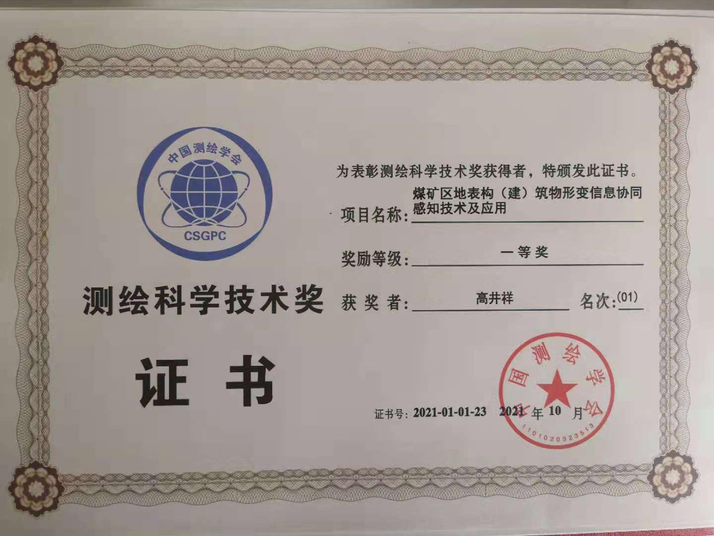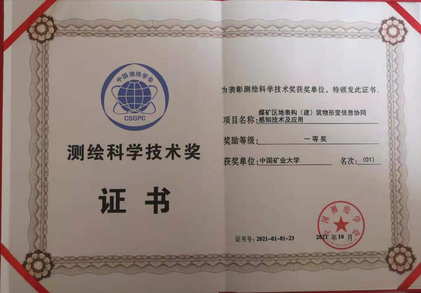 2021年度测绘科学技术奖一等奖证书