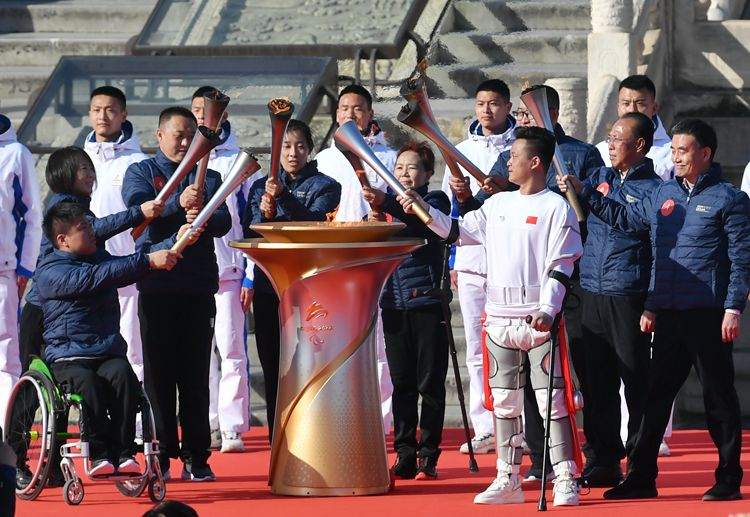 3月2日下午,北京2022年冬残奥会火种汇集暨火炬传递起跑仪式在天坛公园祈年殿举行。采集自英国曼德维尔和中国北京、张家口等九个点位的火种,在火种护卫的护送下来到了北京天坛公园,它们共同汇集生成北京2022年冬残奥官方火种。火种汇集仪式后,以“九天之火”为主题的天坛公园火炬接力正式开始。