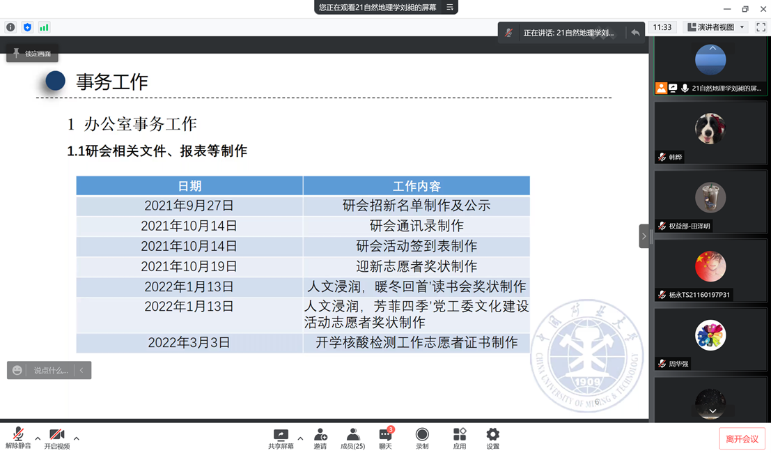 会上,办公室主任刘昶从主要职能和主要工作两个方面着手,回顾了从2021年9月至今的所有活动,着重介绍了办公室开展的理论学习和宿舍安全检查工作,并结合热点从不同方面阐释了党的光荣传统,受到大家一致好评。