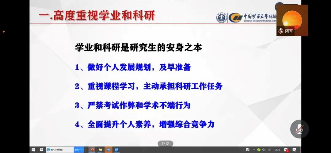 根据当前国内外疫情形势,杨政军老师要求全体研究生骨干全力配合做好疫情防控工作,认真及时做好每日信息摸排和上报工作,督促同学们按时完成日报告和晚点名,落实疫情防控举措。杨政军老师为同学们阐述了疫情防控下学校最新的请假制度和返校规定,要求研究生全体骨干构建好研究生日常管理等精细化体系,精准发现问题,建立完善的学生工作网格。