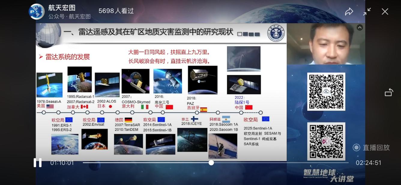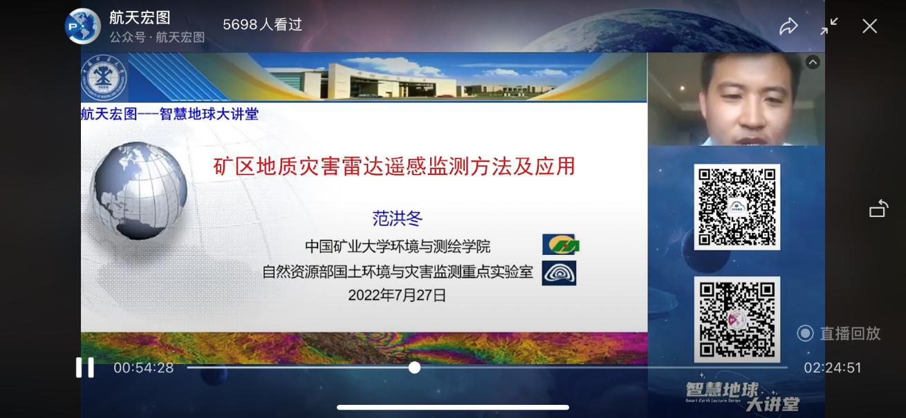 7月27日,应航天宏图信息技术股份有限公司邀请,51视频范洪冬老师做客“智慧地球大讲堂”,在线作了题为“矿区地质灾害雷达遥感监测方法及应用”的学术报告。本次报告共吸引了近5700人次观看,受到国内相关领域专家、学者的关注。