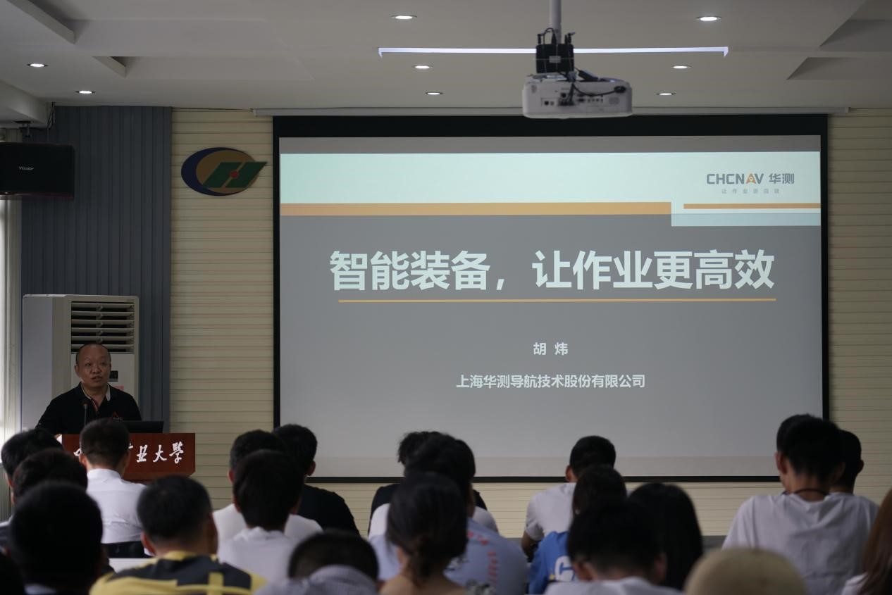 随后,胡炜副总裁受邀在环A512报告厅会议室作题为“智能装备,让作业更高效”的报告,党委副书记韩福顺、教师代表郝明、本科生和研究生代表70余人参加了报告会。胡炜副总裁从测绘的发展历程、智能RTK测量系统、激光雷达移动测绘系统、无人船测量系统、农机导航自动驾驶系统、数字施工管理系统和组合导航系统七个方面向大家进行了介绍。他指出从传统测绘、数字测绘到信息化测绘,再到智能测绘,一代代测绘人的不懈努力推动测绘技术和测绘软件的进步和发展。希望同学们学好专业知识,将所思所学转化为实践动力,更好服务行业和国家发展。