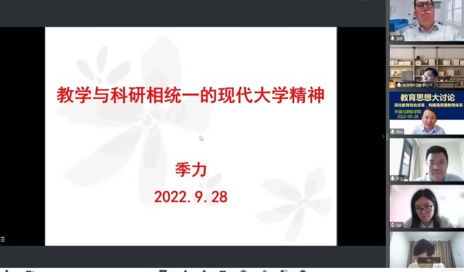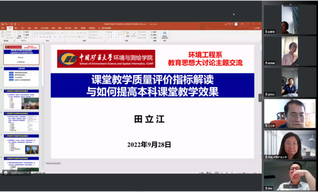 会上,郑南山院长指出本次教育教学思想大讨论是学校本阶段和今年审核评估的重点工作之一,全院上下高度重视,并以党支部为单元落实开展。学校有教育教学思想大讨论的传统,定期开展也是师生共同研讨教书育人、积极改进的重要举措,请全体老师认真对待,积极参与,也感谢学校督导专家组的指导和帮助。测绘组(含机关及实验室)由测绘系主任陈国良、专业负责人范洪冬两位老师主持,开展以“2020版培养方案暨专业认证”为主题的研讨,由范洪冬老师就培养方案建设情况进行汇报,并特别邀请国家万人计划教学名师高井祥教授做专业认证的报告。地信遥感组(含国土系)开展以“课程思政视域下新时代混合课程建设与教学探讨”为主题的交流,并针对课程建设过程中遇到的问题进行了深入研讨。环境科学组由系主任季力教授做了“教学与科研相统一的现代大学精神”的主题报告,从现代大学的思想特质出发,探讨了教学与科研的关系,诠释了二者密不可分、相辅相成的关系,与会教师积极参与讨论。环境工程组围绕田立江老师的“课堂教学质量评价指标解读与如何提高本科课堂教学效果”的专题报告进行研讨交流,各位老师就如何提高学校教学质量,培养卓越环境工程人才,献计献策。