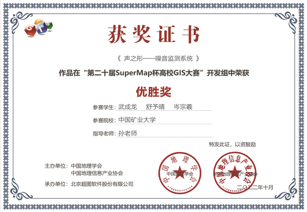 近日,第二十届SuperMap杯高校GIS大赛获奖结果公布,51视频学子武成龙、舒予晴、岑宗羲组成的参赛小组在本次大赛中的作品《声之形——噪声监测系统》获得了开发组组参赛类别的优胜奖。