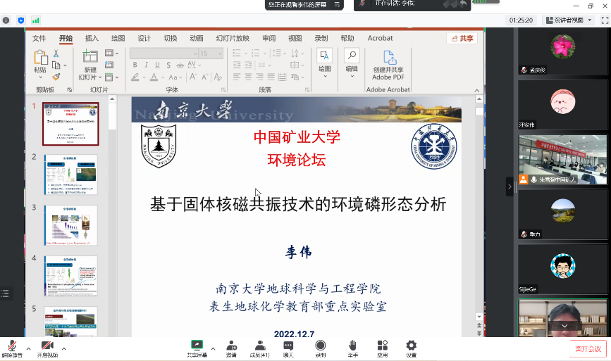 国家优秀青年科学基金获得者南京大学李伟教授作了题为基于固体核磁共振的环境样品磷形态分析的报告。报告从全球磷循环、核磁共振技术、固体核磁共振分析环境样品的方法学体系,从单一体系、复合体系、环境体系三个方面重点介绍了土壤磷核磁方法、界面磷吸附过程中分子形态及其吸附机制。