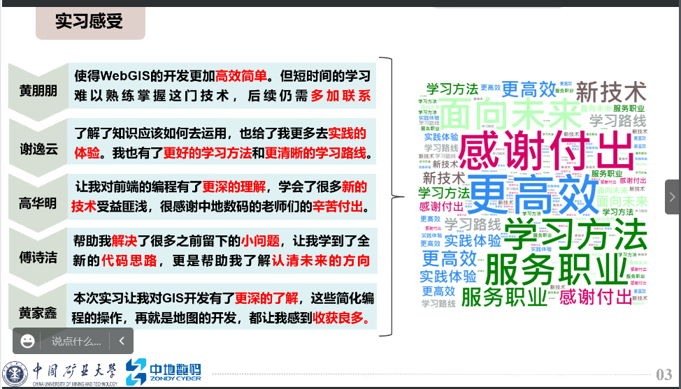 实习设置了Web开发、GIS软件操作、数据库开发、WebGIS开发、项目开发实践以及个人成长与职业规划等七个实习内容模块,既涵盖了课堂理论知识的巩固与进阶,又重点强化了GIS应用开发及项目实战,全方位提升了学生的业务分析能力、编程开发能力、沟通表达能力及团队协同能力,同时为学生提供了感知行业发展前景与职业发展规划的指导。