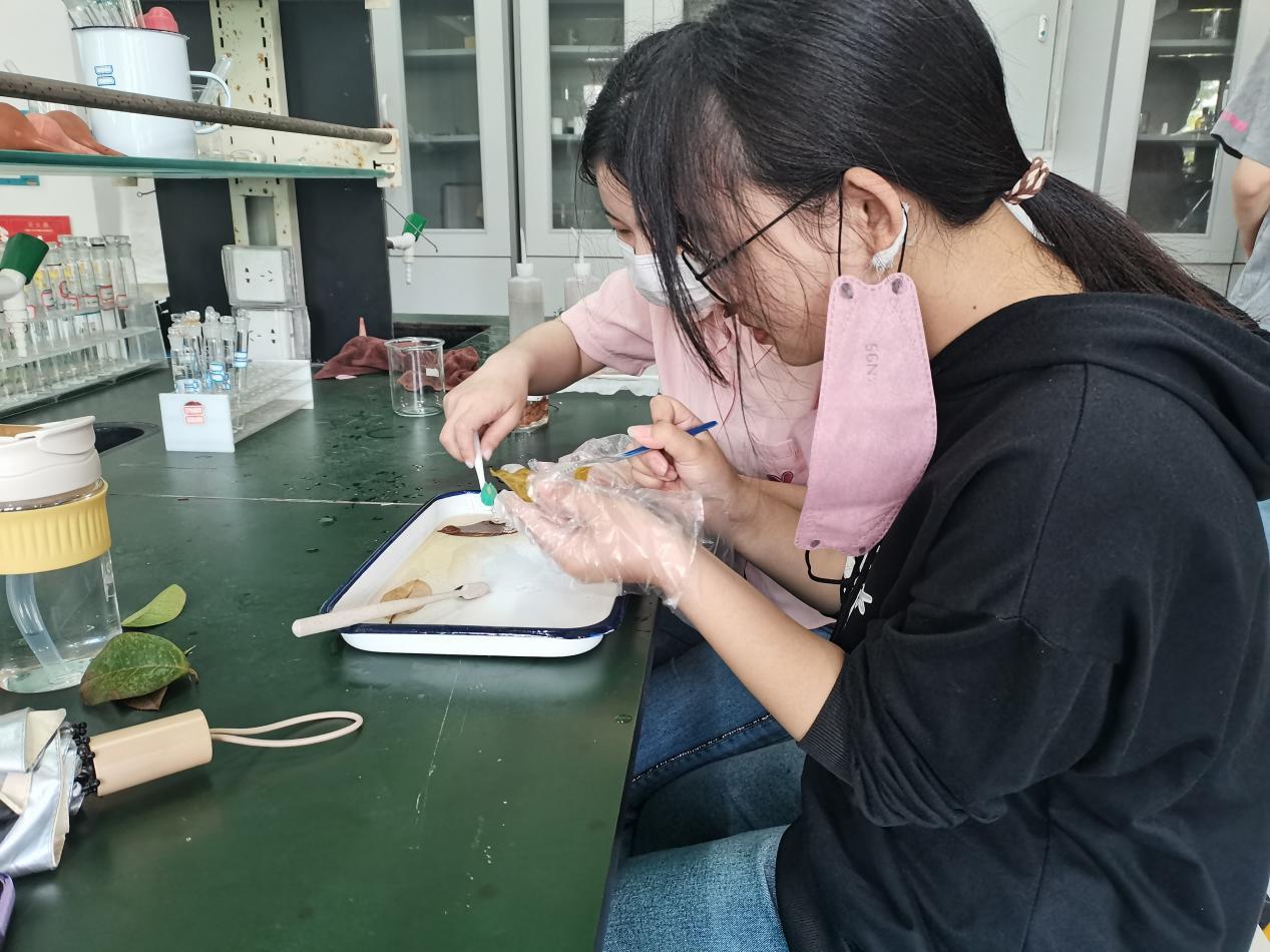 叶脉书签制作课程中,任课教师指导同学们调查了校园中的乔木、灌木情况、采集适合叶片,随后返回实验室开展配药、叶肉消煮、去除、漂白与染色工作,最后各位老师进行现场打分考核。校园垃圾分类调查课程中,任课教师带领同学们在南湖校园环线食堂、宿舍、教学行政楼垃圾桶、校污水处理站、垃圾转运站等地调查了垃圾产量及组成、垃圾桶规格及数量、分类收集情况与效果等,并根据现场调查结果及专业知识提出了垃圾减量、分类、利用的相关建议和措施。