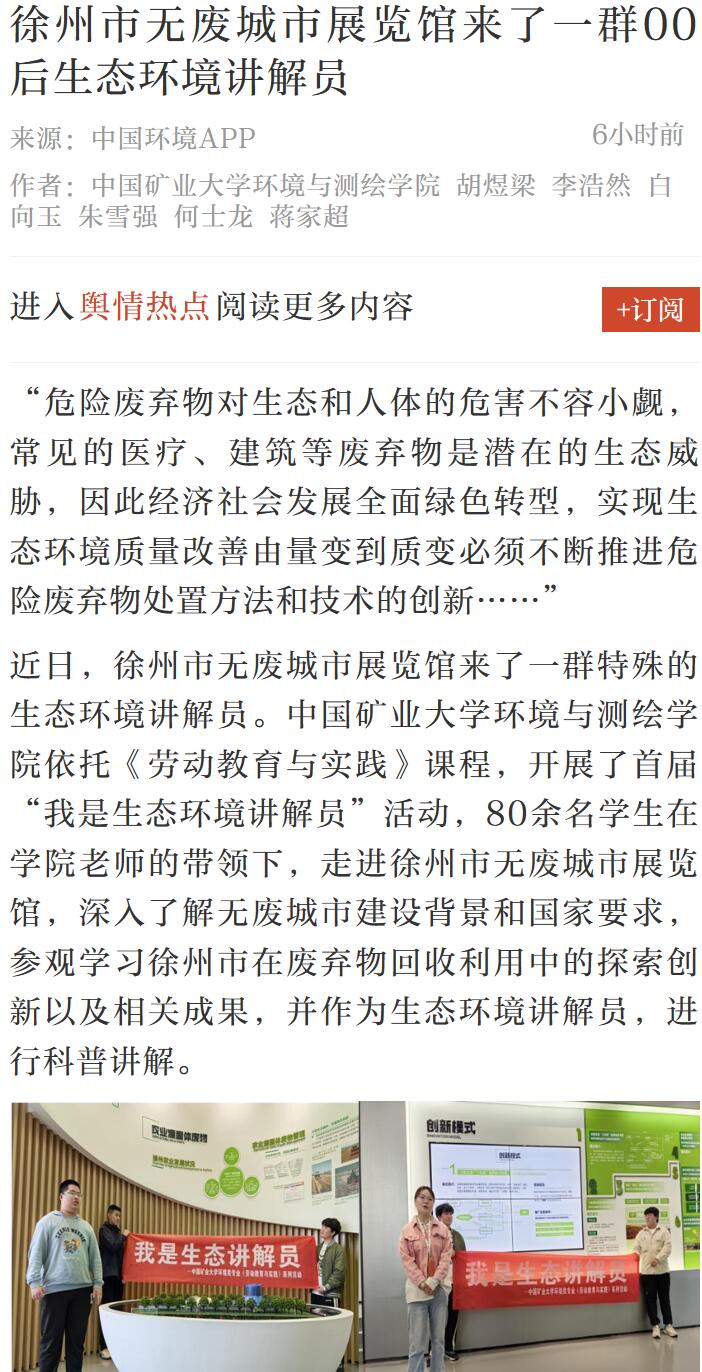 近日,《中国环境》、《徐州日报》分别以“徐州市无废城市展览馆来了一群00后生态环境讲解员”、“产教融合助力人才培育”为题,报道了51视频依托产教融合协同育人示范基地,丰富课程内容、拓展活动形式,并将课程转化为更多可服务于社会的成果。